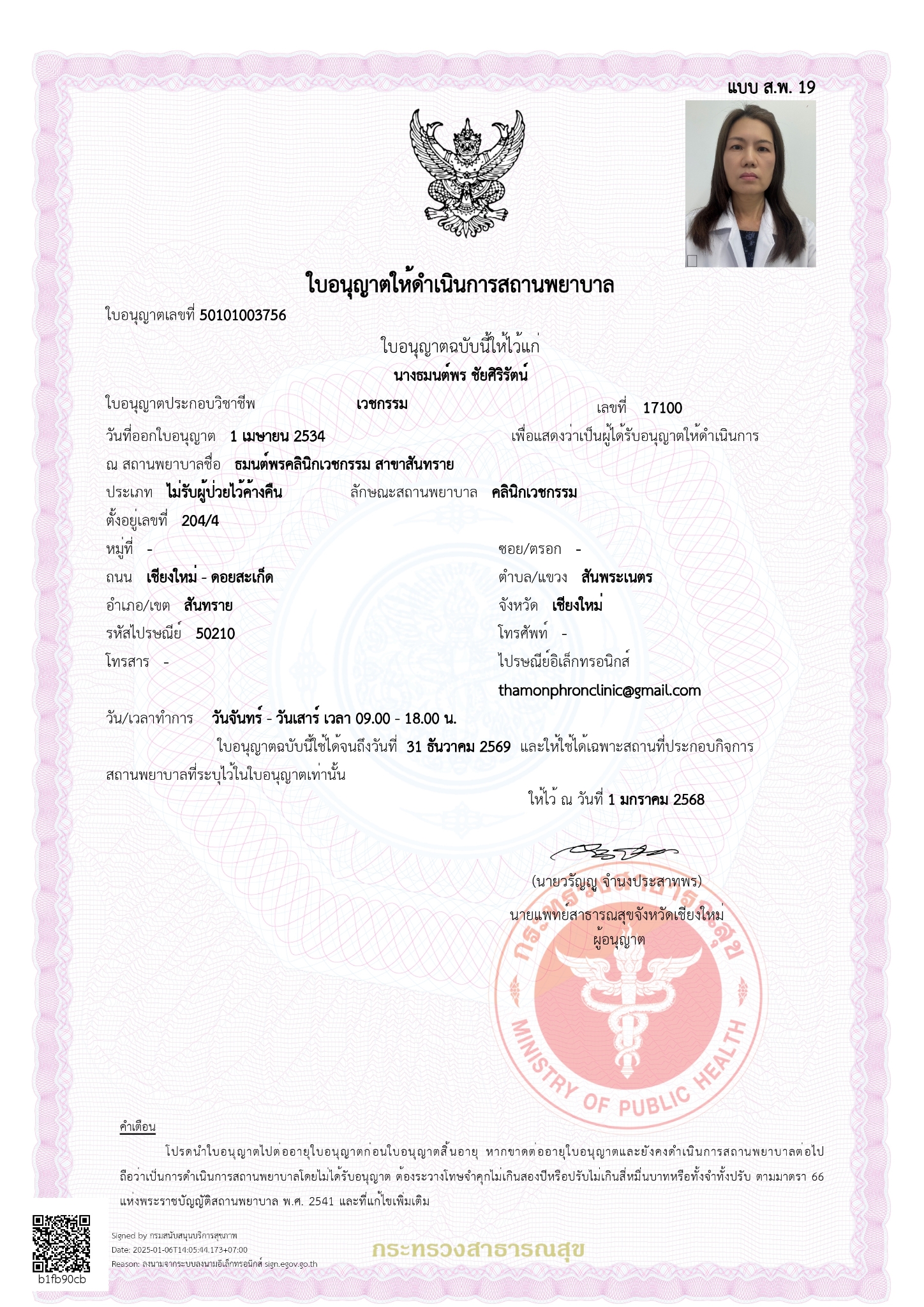 ธมนต์พรคลินิกเวชกรรม เป็นสถานพยาบาลขึ้นทะเบียนแผนปัจจุบันชั้น 1 ให้บริการทางการแพทย์ ตรวจรักษาโรคทั่วไป โรคเรื้อรัง โรคผิวหน้ง สิว ฝ้า กระ ไฝ หูด แผลเป็นปลูกผม ผมร่วง ปัญหาหนังศีรษะฝังเข็ม ครอบแก้ว
